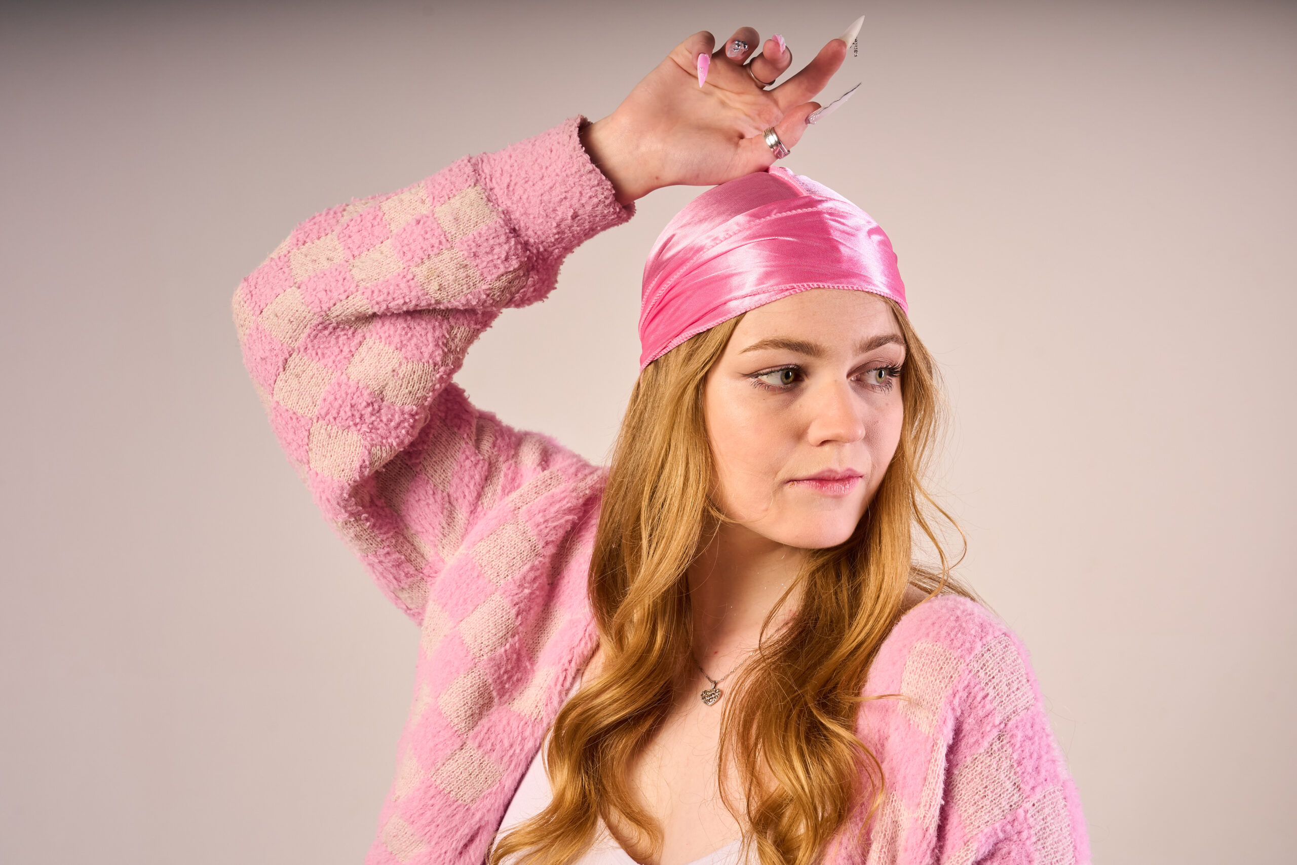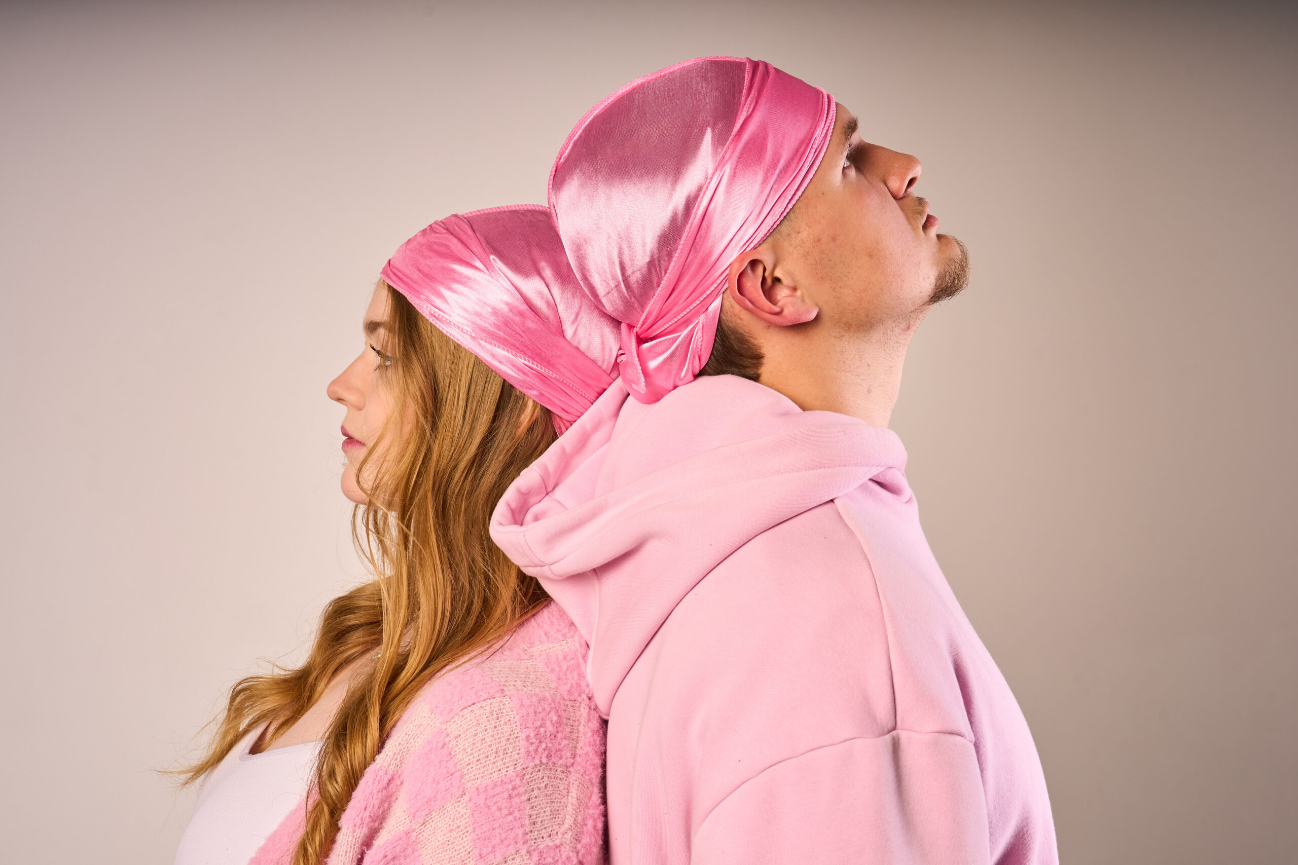 Jasnoróżowy satynowy durag wykonany z elastycznego lodowego jedwabiu.