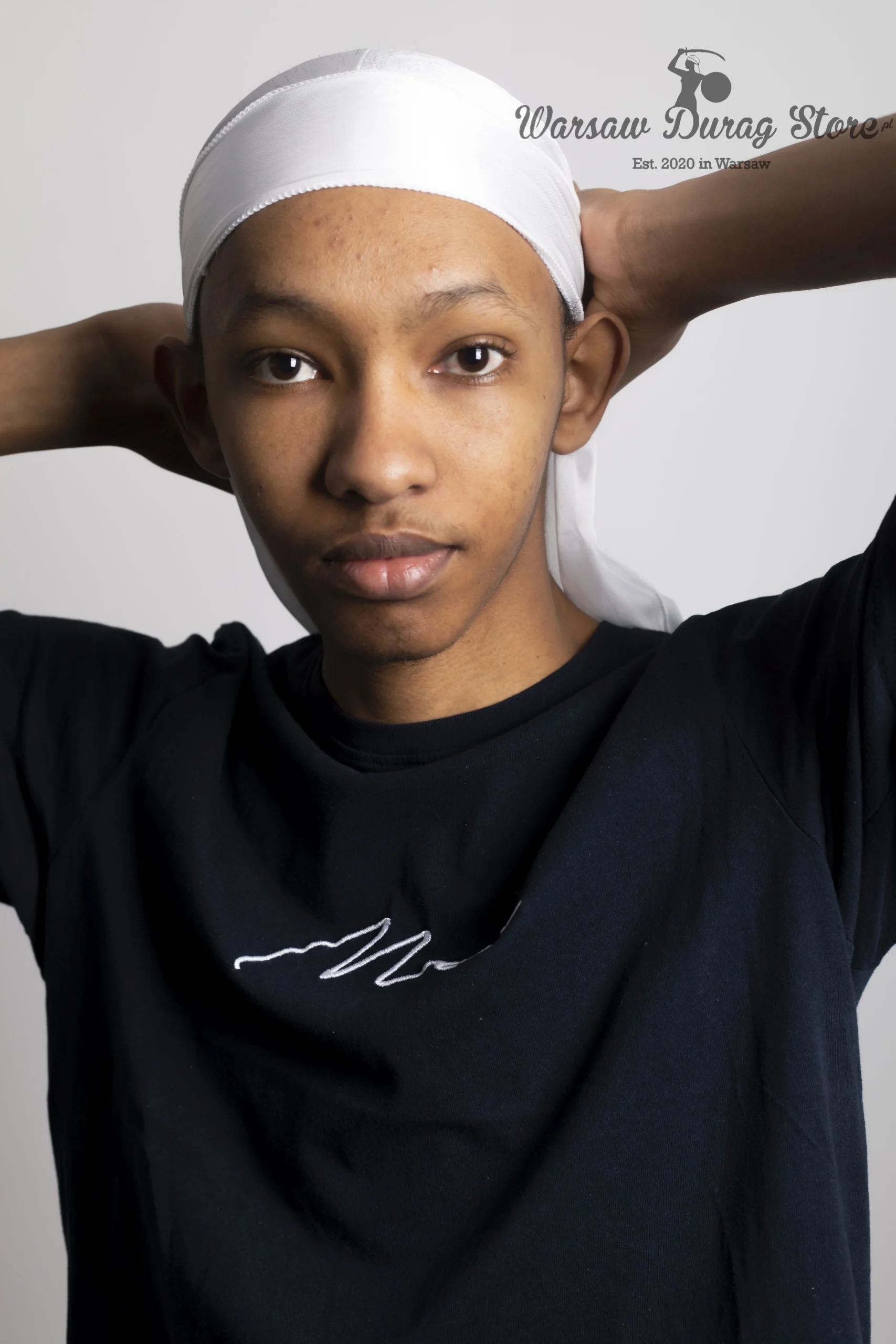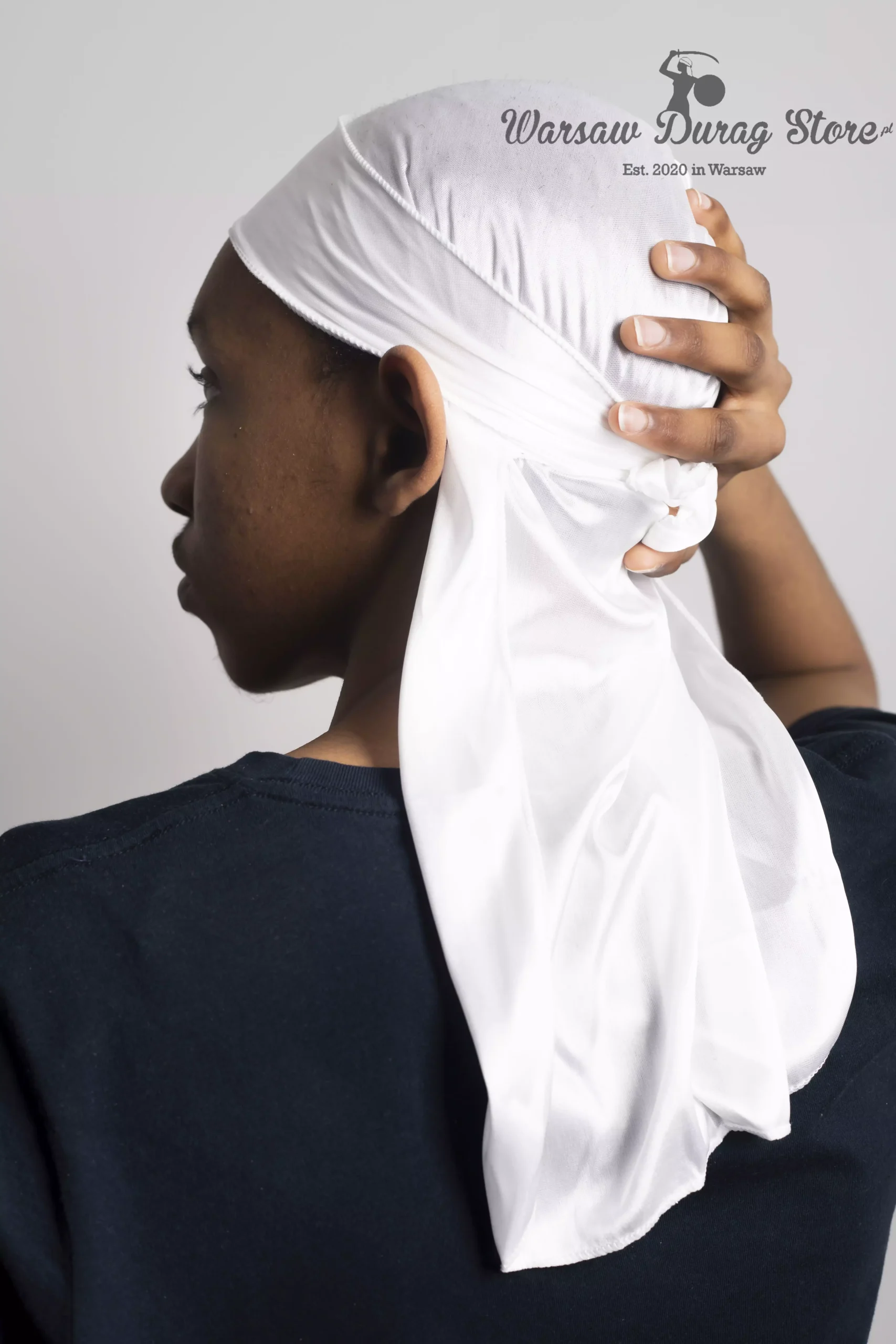 Biały satynowy durag wykonany z elastycznego lodowego jedwabiu.